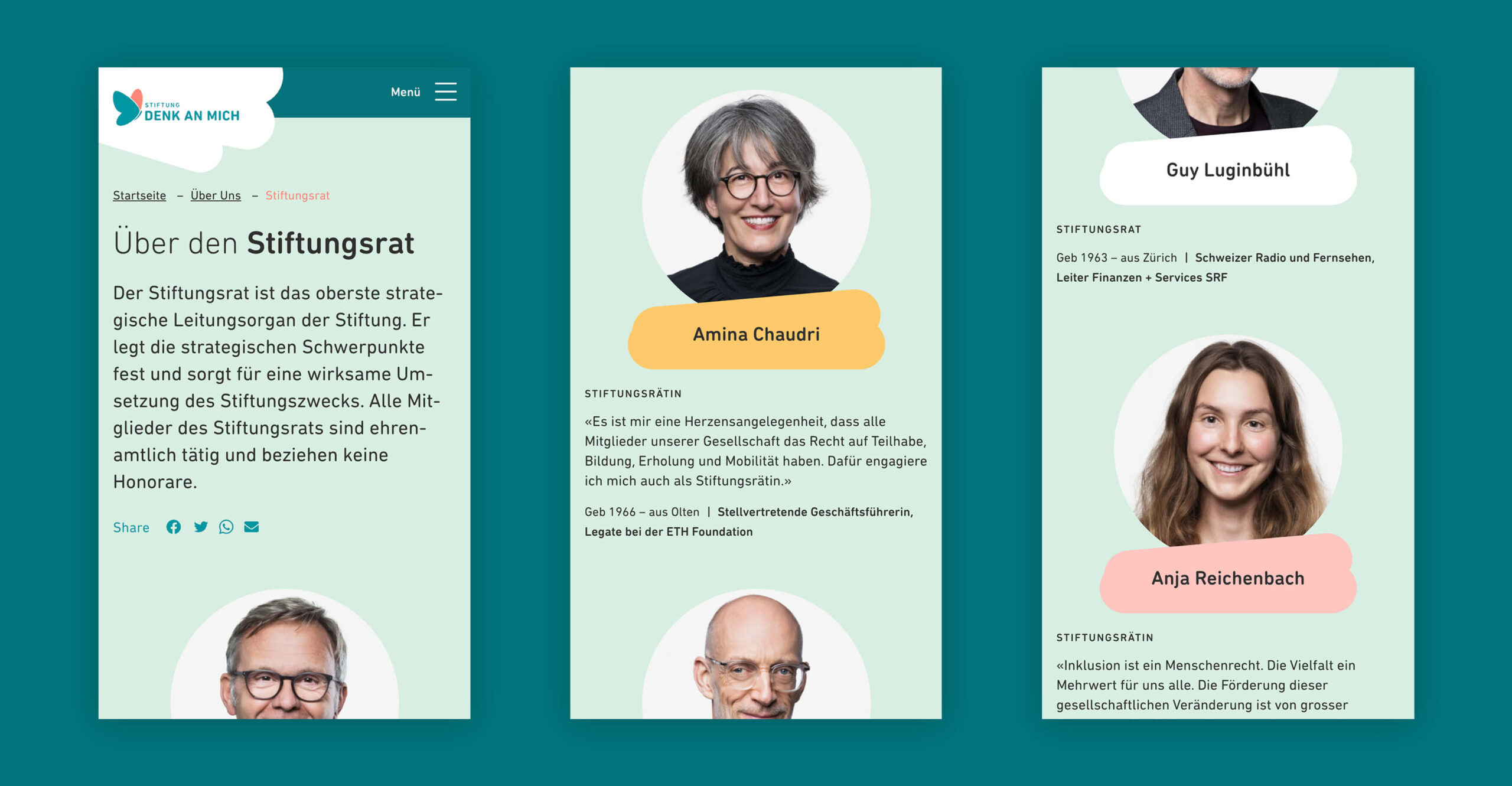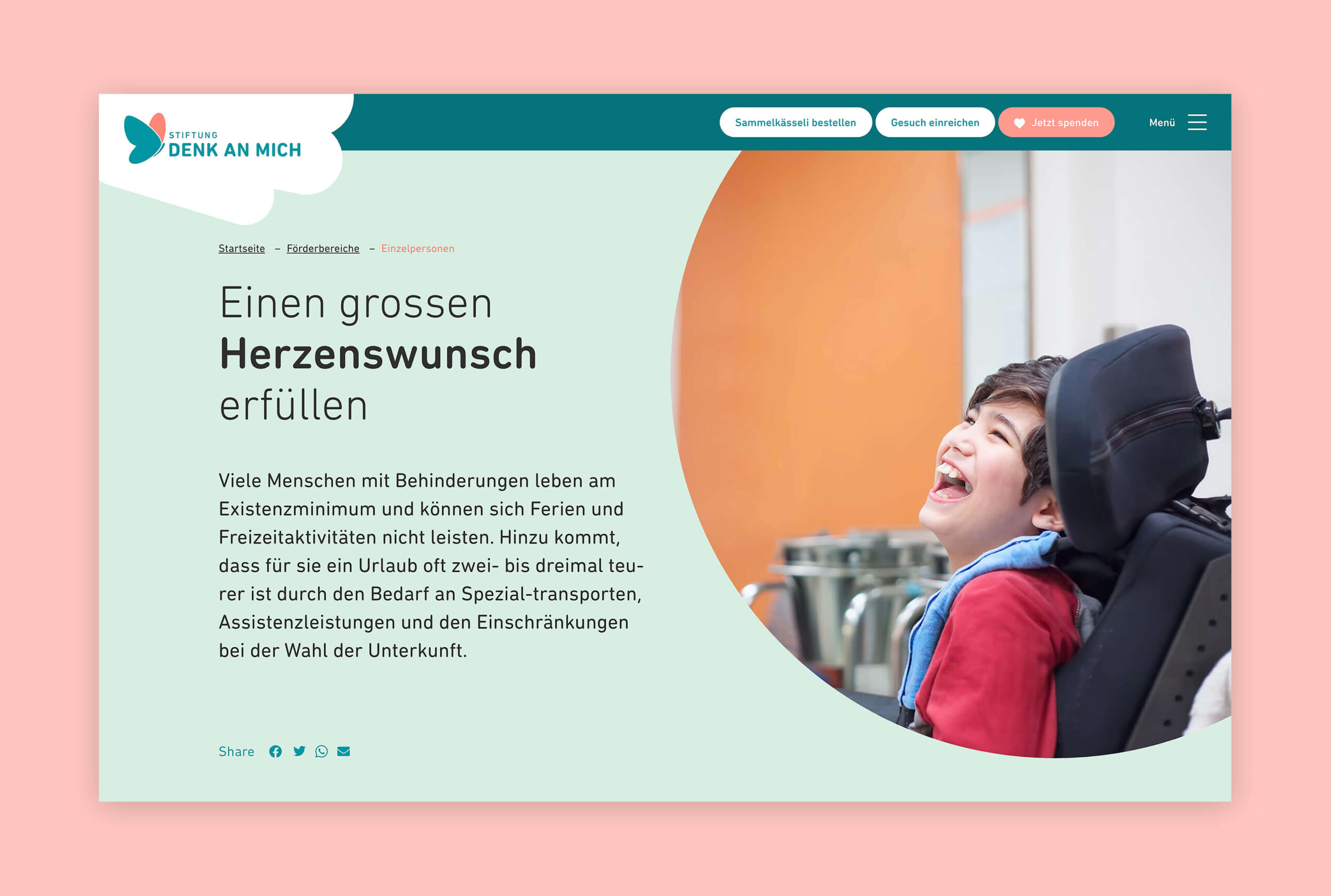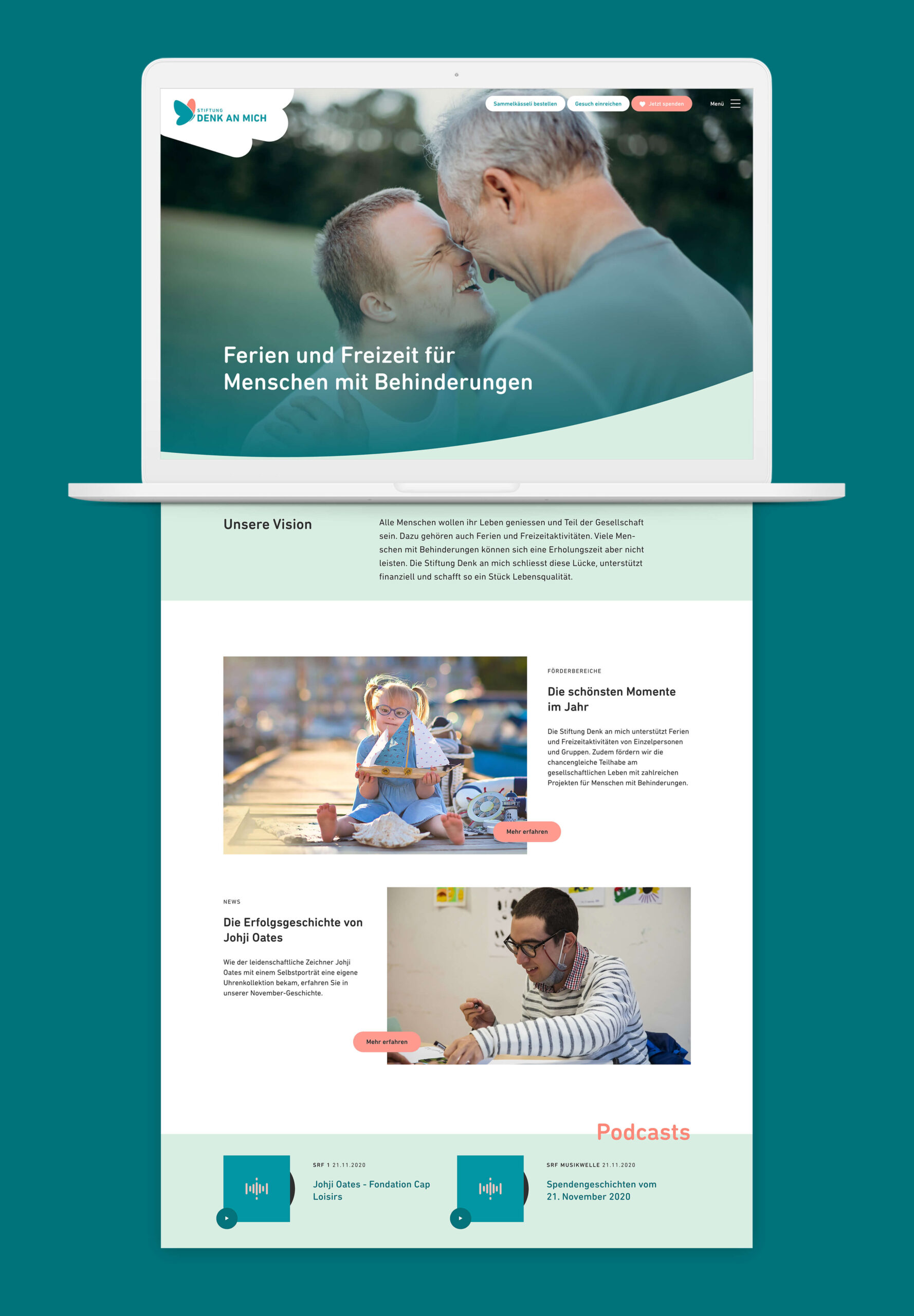 Die Stiftung Denk an mich fördert Menschen mit Behinderung und organisiert solidarische Projekte in den verschiedensten Bereichen. Neben dem Wunsch nach einem neuen Gesamtauftritt, wollte die Stiftung mit ihrem Webauftritt den heutigen Anforderungen der digitalen Welt gerecht werden. Denn für den Neuauftritt sollte nicht nur die vielseitige Stiftungsarbeit kommuniziert werden, die neue Webseite brauchte eine einfache und intuitive Anbindung an ein Spendenkonto, damit für die verschiedenen Zwecke möglichst einfach und ohne grossen administrativen Aufwand Geld gesammelt werden kann. Ausserdem ist der unkomplizierte Zugang zu Informationen und Anlaufstellen für Direktbetroffene und Angehörige essentiell.
