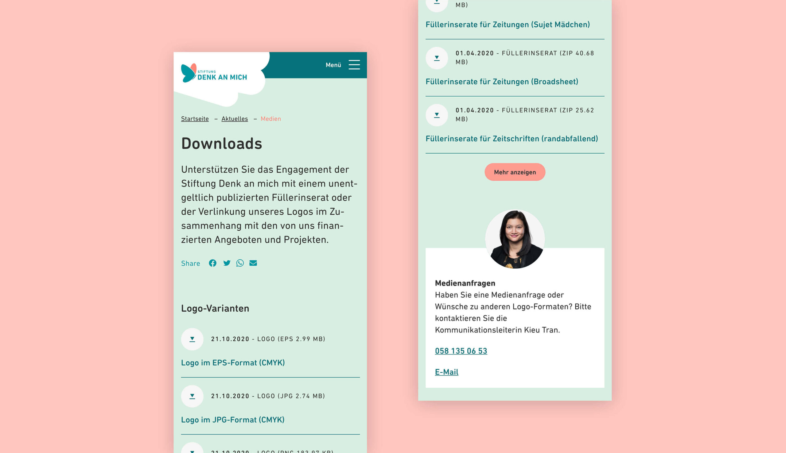 Gemeinsam mit der Webagentur novu wurde in iterativem Vorgehen zusammen mit Denk an mich die neue Webseite konzipiert. Basierend auf dem neuen Corporate Design gestaltete KARGO für die unterschiedlichen Inhalte verschiedene Seitenlayouts und Inhaltskomponenten. Dies ermöglicht Denk an mich bei der Darstellung von Inhalten möglichst flexibel zu sein. Komplettiert wird das visuelle Erscheinen der Webseite mit einem passenden Bildkonzept.