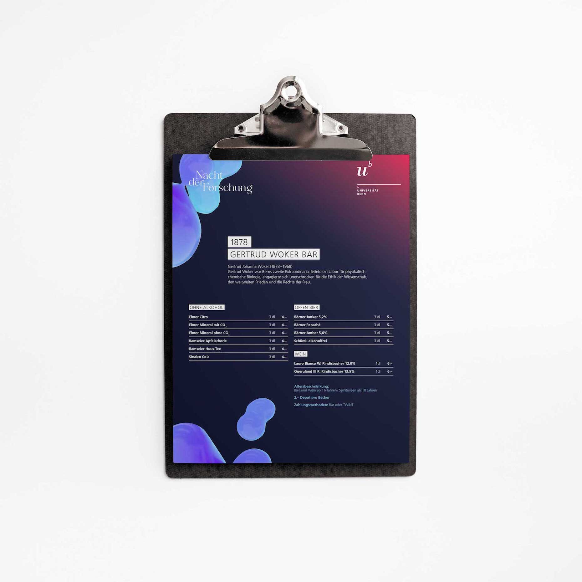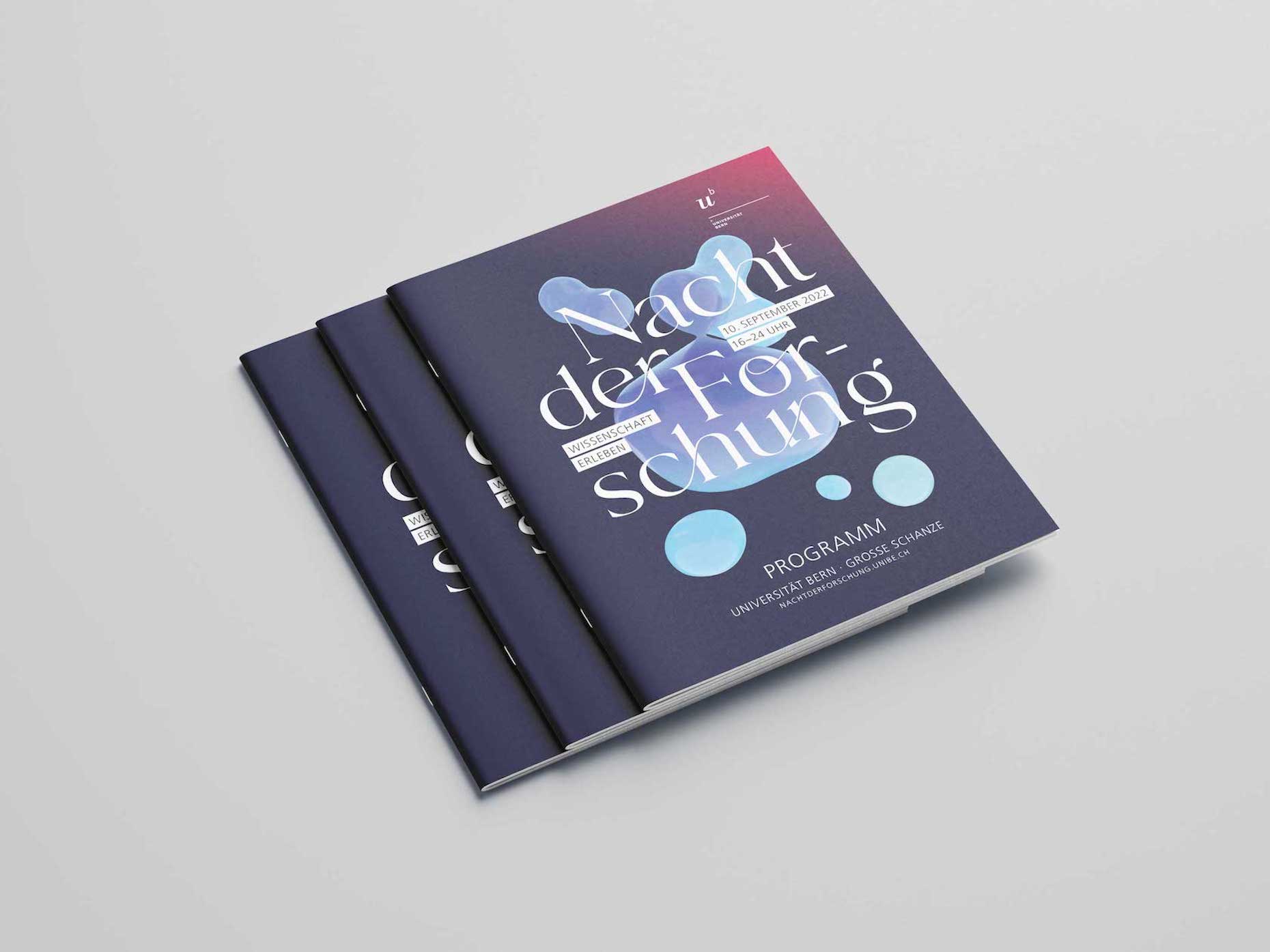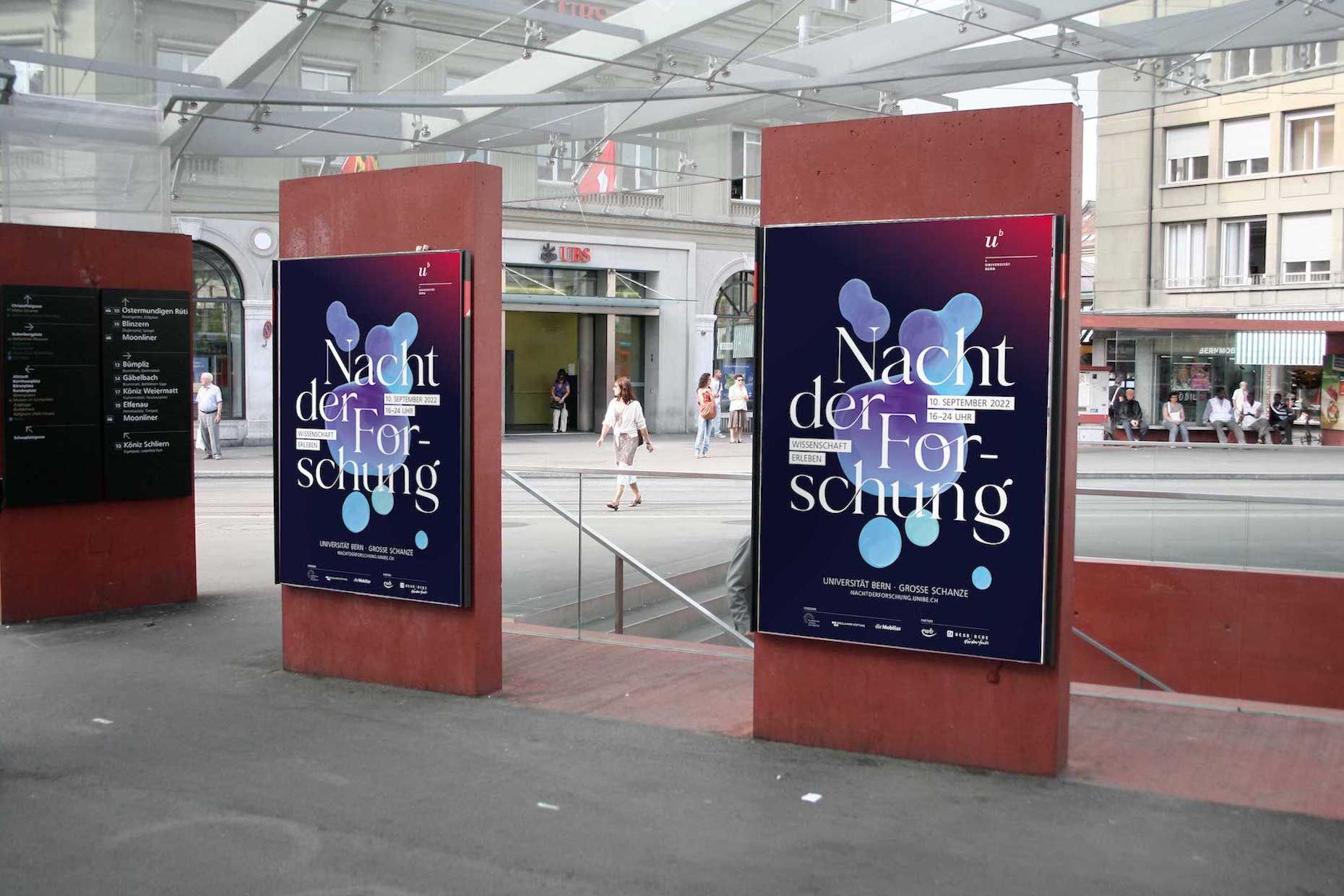 Das neue Gesicht der Nacht der Forschung 2022 prägte im Vorfeld der Veranstaltung unterschiedlichste Touchpoints. Die einprägsame Kombination aus der neuen Bildmarke und der abstrakten Visualisierung war statisch und animiert auf diversen OOH- und DOOH-Massnahmen zu sehen, zierte sämtliche Kommunikationsmittel, wie Flyer und Programmbooklets, wurde über die Social Media-Accounts der Universität Bern fleissig geteilt und diente letztlich auch als szenografische Grundlage am Event selbst.